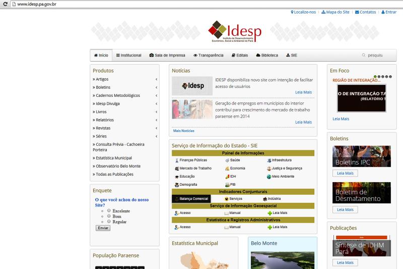 O site do Instituto de Desenvolvimento Econômico, Social e Ambiental do Pará (Idesp) ganhou um novo layout que facilita o acesso e a busca por informações, publicações e pesquisas. A página na internet é um dos principais meios utilizados pelo Idesp para cumprir a sua principal missão, que é a de disseminar conhecimento e informação para subsidiar o planejamento de políticas públicas e do desenvolvimento econômico, social e ambiental do Pará.