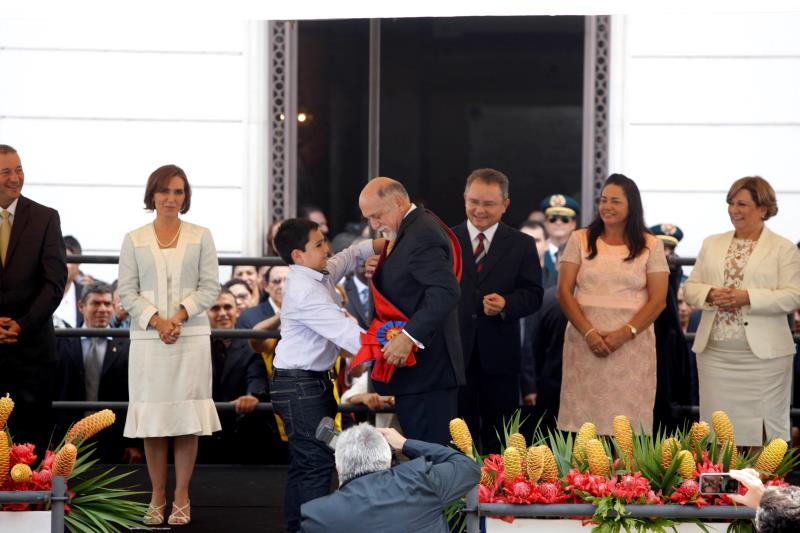 Um menino de apenas nove anos, Maurício Haber, protagonizou o momento mais simbólico da solenidade de posse do governador Simão Jatene, na manhã desta quinta-feira (1º). Ele foi convidado a colocar a faixa no governador reeleito, representanto o povo paraense, no palanque em frente ao Palácio Lauro Sodré, no centro histórico de Belém. A aposição da faixa ocorreu após o governador Simão Jatene e o vice-governador Zequinha Marinho assinarem o termo de posse e fazerem o juramento solene no plenário da Assembleia Legislativa, em cerimônia presidida pelo deputado Márcio Miranda, presidente da Casa.
