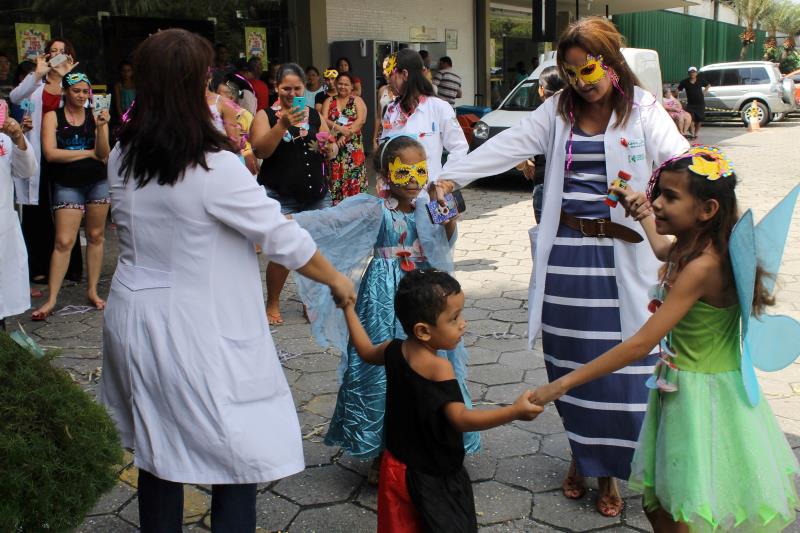 As crianças da pediatria e seus responsáveis também marcaram presença com fantasias e muito sorriso no rosto. Brincadeira de roda, trem, pinturas e desenhos embalaram a festa. “É muito importante ‘quebrar o clima’ de hospital. Quando a gente pode ver nosso filho se divertindo, mesmo aqui nesse ambiente, melhora tanto para ele quanto para nós”, disse Elis Gardenha, mãe do pequeno Éber Júnior, paciente internado do hospital.