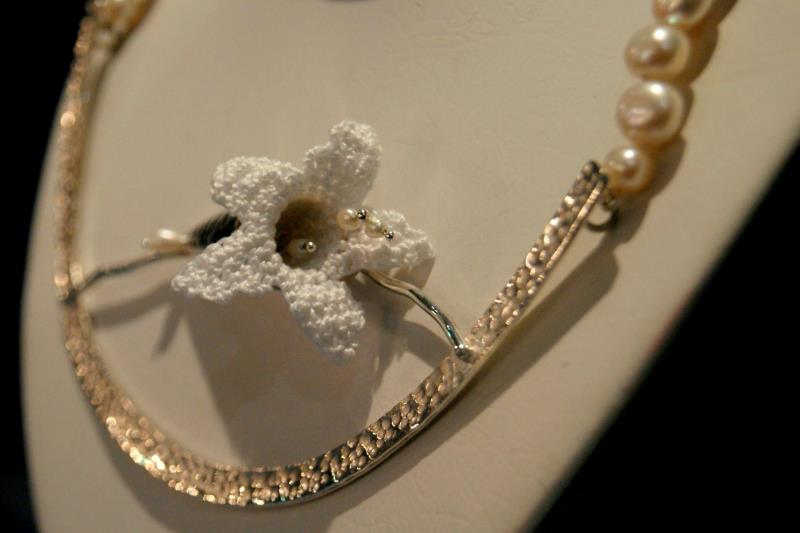 O colar e o anel da coleção foram produzidos em prata com pérolas barrocas, com destaque para a flor tecida em crochê de linha branca, um lírio, que também é um símbolo do Círio de Nazaré. “O lírio foi tecido minuciosamente e as pérolas são o detalhe da peça, representando, ao mesmo tempo, a semente, o embrião e Jesus”, conta Lídia.