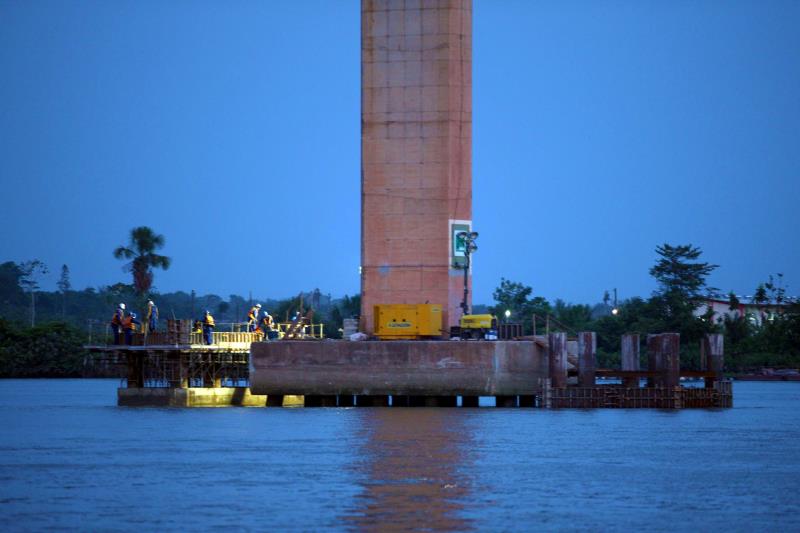 O operário Carlos Nunes empunha com orgulho a pá de pedreiro, companheira de trabalho há 20 anos, exibindo-a como um troféu ao fotógrafo Sidney Oliveira, posicionado na lancha que descreve um arco em torno do pilar 14 da ponte Moju-Cidade, a 120 quilômetros de Belém. Carlos ajudou a reconstruir o pilar onde esta semana terminam de ser assentadas as vigas de sustentação da nova pista sobre o Rio Moju, abrindo a contagem regressiva para o fim dos trabalhos, previsto para 31 de dezembro pelo secretário de Transportes do Pará, Kléber Menezes.