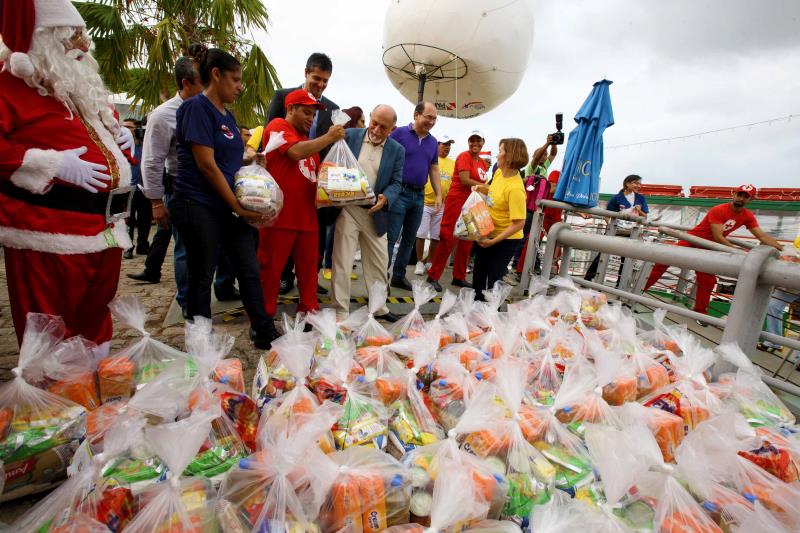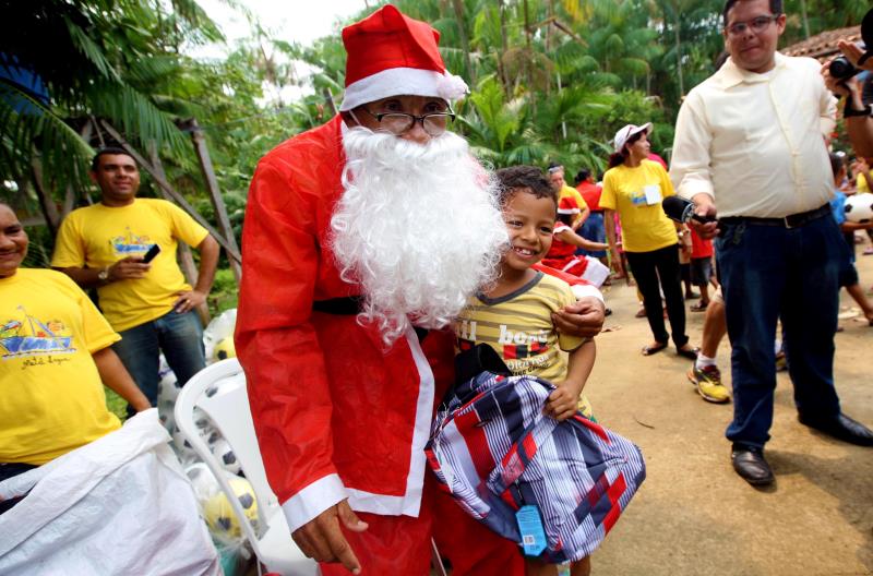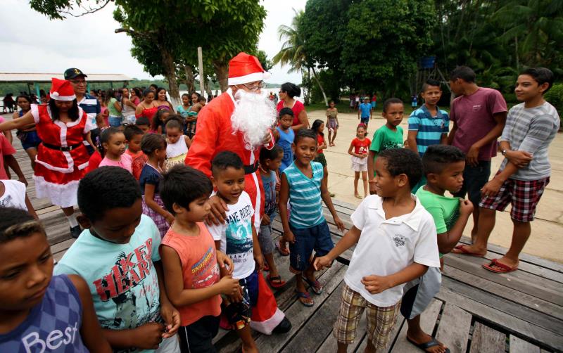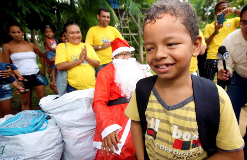 Cristiano Ronaldo, 8 anos, tem nome de craque do futebol mundial, mas neste Natal dispensou a tradicional bola como presente. Quando rezava à noite, ele pedia para ganhar do Papai Noel um kit de material escolar. “Quero mochila, caderno, lápis e lápis de cor. Gosto muito de estudar. Só faltei à escola uma vez, porque me deu febre”, contou o garoto. Ele era uma das dezenas de crianças da Ilha do Maracujá, em frente ao Combu, que recebeu nesta quinta-feira (3) o Natal D’Água, ação que leva cestas básicas e brinquedos a famílias carentes em todo o Estado.