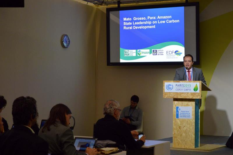 A criação de uma agenda econômica verde e o desenvolvimento da agricultura sustentável foram temas do painel “Mato Grosso, Pará: Amazon State Leadership on Low Carbon Rural Development”, realizado durante a 21ª Conferência sobre Mudanças Climáticas, que acontece em Paris. Para compor a mesa de debate, foram convidados o secretário extraordinário do Programa Municípios Verdes (PMV), Justiniano Netto; a ex- ministra de Meio Ambiente e ex-senadora Marina Silva; a pesquisadora do Instituto do Homem e do Meio Ambiente (Imazon), Brenda Brito; o governador do Estado do Mato Grosso, Pedro Taques; o representante do Instituto Centro de Vida (ICV), Laurent Micol, e Andréa Azevedo, do Instituto de Pesquisa Ambiental da Amazônia(IPAM)