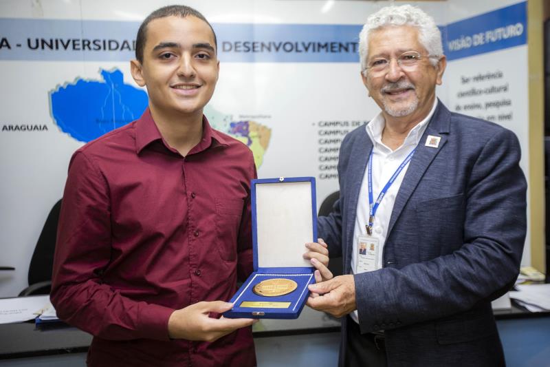 O estudante Fabio do Amaral Junior, de 19 anos, calouro do curso de Medicina da Universidade do Estado do Pará (Uepa) em 2019, com a pontuação de 910 no Exame Nacional do Ensino Médio (Enem), ocupou a primeira colocação no Prosel UEPA 2019 e recebeu, nesta quinta-feira (13), das mãos do reitor Rubens Cardoso e da Pró-reitora de Graduação Ana da Conceição, a medalha Fernando Guilhon.