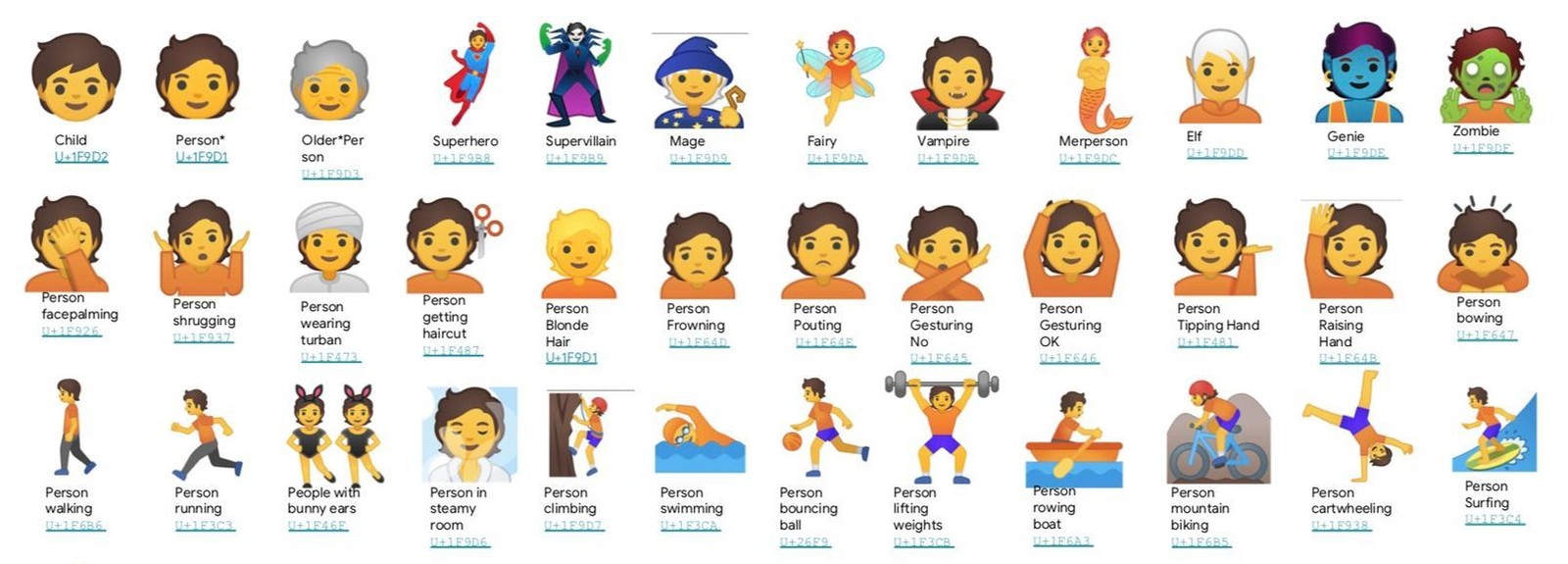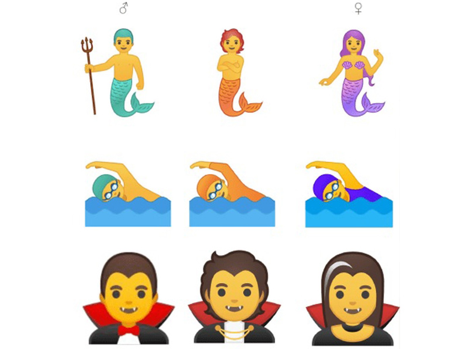 Há o emoji de um nadador, que em vez de sunga ou maiô veste um traje de mergulho. Há o vampiro com penteado estiloso e acessórios no pescoço. Como também tem zumbis, gênios da lâmpada e atletas de diferentes modalidades esportivas com três ou mais opções de gênero em vez de duas. A ideia é abandonar referências tipicamente masculinas ou femininas e mergulhar no amplo acervo de possibilidades.