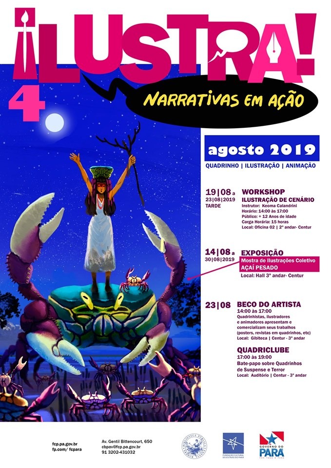 Nesta edição de agosto de 2019, o workshop será de ilustração de cenário com o concept artist e ilustrador Keoma Calandrini. No período de 19 a 23 de agosto, das 14 às 17h, no 2º andar do Centur, com inscrição gratuita. A exposição da vez é dos artistas do Coletivo de quadrinhos Açaí Pesado, que irá começar do dia 14 e se prolongará até o dia 30 deste mês, no Hall do 3º andar do Centur. A exposição terá como tema Lendas Urbanas, em homenagem ao grande escritor paraense Walcyr Monteiro, falecido em maio deste ano.