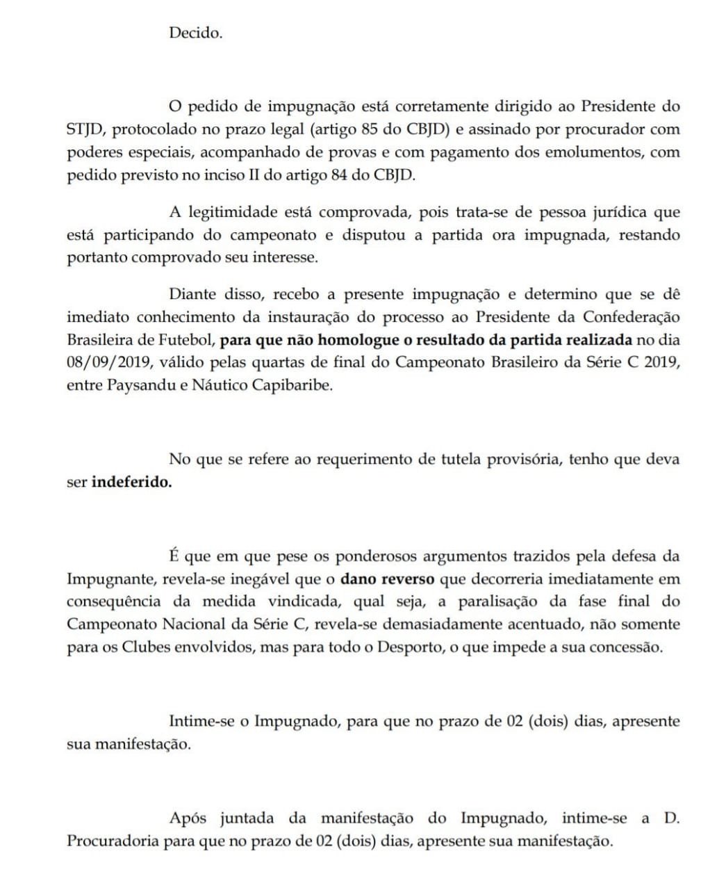 "Recebo a presente impugnação e determino que se dê imediato conhecimento da instauração do processo ao Presidente da Confederação Brasileira de Futebol, para que não homologue o resultado da partida realizada no dia 08/09/2019, válido pelas quartas de final do Campeonato Brasileiro da Série C 2019, entre Paysandu e Náutico Capibaribe", disse o presidente do STJD no site oficial da entidade.