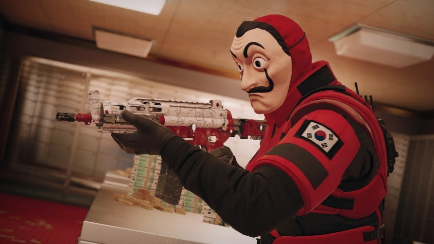 O evento é ambientado no mapa “Banco”, conta com a volta do modo de jogo “Refém” e tem o próprio refém disfarçado com os icônicos macacão vermelho e máscara usados pelos personagens da série, assim como os personagens Vigil e Hibana, de Rainbow Six Siege, que também poderão usar os trajes temáticos. Ao todo, serão oito itens exclusivos à disposição dos jogadores – entre uniformes, equipamento de cabeça (headgear), estampas de armas e amuletos –, que poderão ser adquiridos por 1.680 créditos R6.