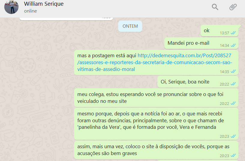 Disponho, agora, alguns prints das várias denúncias que estou recebendo desde terça-feira, e também o print da conversa que tive com Serique - na verdade, um monólogo - visto que ele não me respondeu, até este momento.