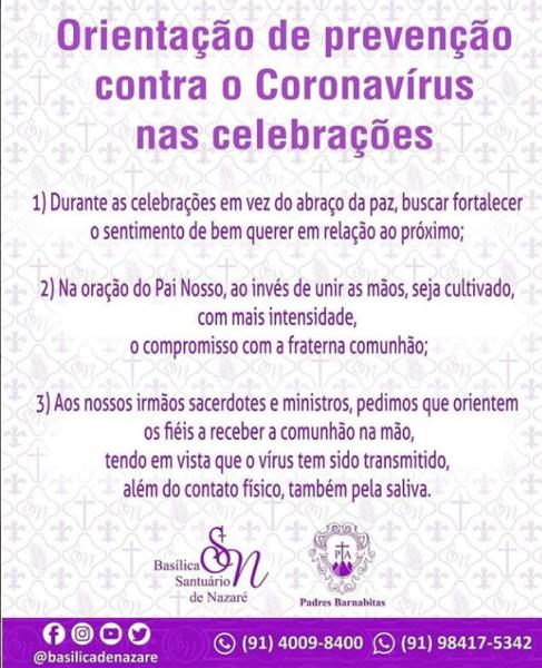 A Basílica Santuário de Nazaré e os Padres Barnabitas, junto a Arquidiocese de Belém, atentam-se com a atual situação de casos referentes ao Coronavírus (COVID-19) – não só este, mas também com vários outros tipos de vírus transmitidos por meio do ar –, e apresentam orientações de prevenção para que se evite possíveis transmissões.