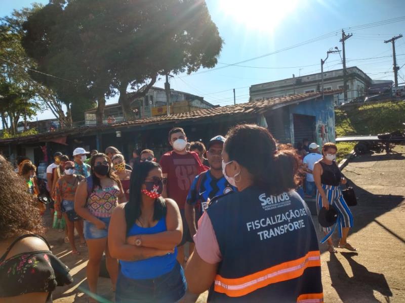 Os agentes de transporte da Superintendência Executiva de Mobilidade Urbana de Belém (SeMOB) orientaram e organizaram as filas e o embarque na rampa de acesso, com o objetivo de evitar aglomeração, em obediência ao protocolo sanitário para evitar a contaminação da Covid-19.