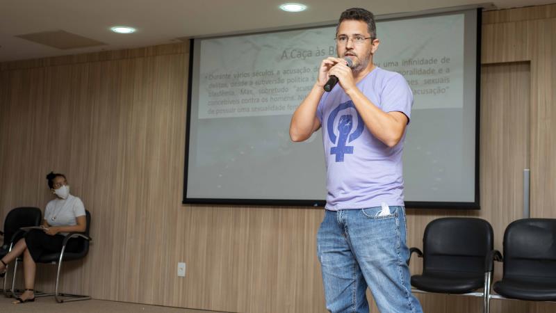 O psicólogo, professor e pesquisador Carlos Mendes Rosa abordou, durante palestra, temas como gênero e sociedade, as limitações impostas pela sociedade na definição de comportamentos masculino x feminino, e a opressão que mulheres sofrem por causa do gênero.