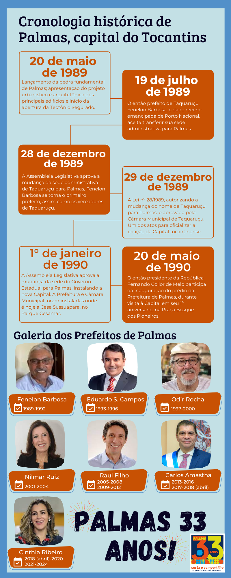 Por meio dessas histórias, a Prefeitura homenageia todos que nasceram em Palmas e aqueles que escolheram o município para viver. Muitos desses residem na Capital desde o lançamento da pedra fundamental, em 20 de maio de 1989. Esse foi o primeiro grande evento público da cidade, na Praça dos Girassóis. Poucos meses depois, no dia 5 de julho, a Assembleia Legislativa (AL) dava à Capital do Estado do Tocantins o nome de Palmas, transformando em lei o que até então era um sonho.
