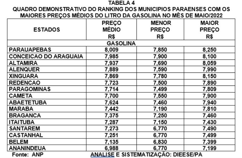 Ainda segundo o ESTUDO do DIEESE/PA, também no mês passado (Mai/2022), segundo os dados da ANP, entre os Municípios paraenses, Parauapebas foi quem comercializou o litro da gasolina mais caro, custando cerca de R$ 8,009, seguido de Conceição do Araguaia com o preço médio de R$ 7,985; Altamira com o preço médio de R$ 7,937; Xinguara com o preço médio de R$ 7,869; Alenquer com o preço médio de R$ 7,889; Redenção com o preço médio de R$ 7,723; Paragominas com o preço médio de R$ 7,714; Cametá com o preço médio de R$ 7,700; Abaetetuba com o preço médio de R$ 7,624; Marabá com o preço médio de R$ 7,442; Bragança com o preço médio de R$ 7,375; Itaituba com o preço médio de R$ 7,287; Santarém com o preço médio de R$ 7,273; Castanhal com o preço médio de R$ 7,251; Belém com o preço médio de R$ 7,135 e de Ananindeua com o preço médio de R$ 7,199.