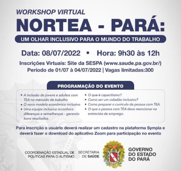 Estão abertas as inscrições para o workshop NORTEA/PARÁ: um olhar inclusivo para o mundo do trabalho. Evento gratuito e com certificação! Mais um projeto desenvolvido e executado pela CEPA/SESPA em parceria com o SEBRAE/PARÁ primando pela efetivação de políticas públicas inclusivas no Estado. As inscrições são limitadas e podem ser realizadas no site da SESPA ou pelo link abaixo na Bio. Para participação no evento é necessário: criação de conta no SYMPLA ,download do aplicativo ZOOM.