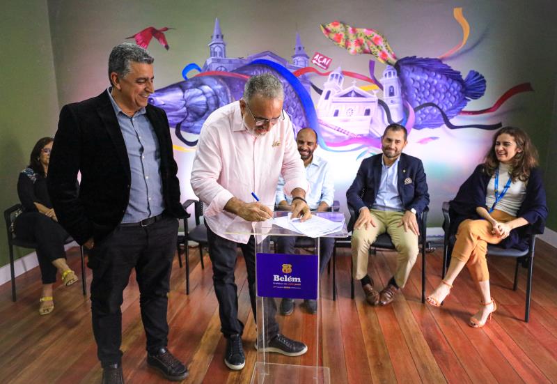 O prefeito de Belém assinou os documentos ao lado do vice-prefeito, Edilson Moura, e do representante da Acnur no Brasil, Davide de Tozilli.
