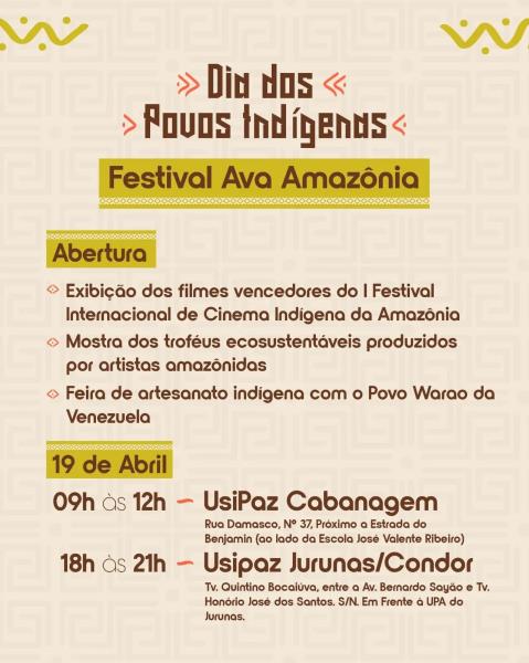 O lançamento da mostra acontecerá no dia 19 de abril na UsiPaz da Cabanagem (9h-12h) e Jurunas (18h-21h), juntamente com a exposiçao dos troféus AVA ecosustentáveis produzidos por artistas Amazônidas e feira de artesanato indígena com o Povo Warao da Venezuela.