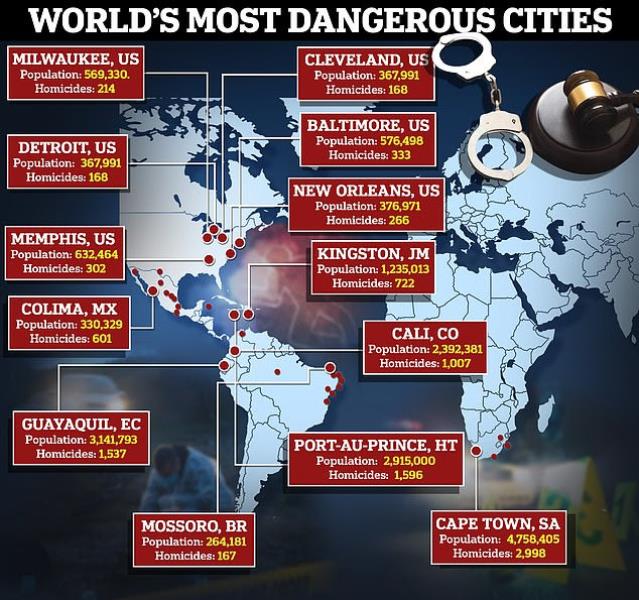 A matéria destaca características como violência de gangues, tiroteios em massa, pobreza e populações extensas. A maioria dessas cidades está localizada no Hemisfério Ocidental, incluindo cidades na América do Sul, como o Brasil, e América Central, além dos Estados Unidos.