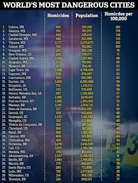 Entre as dez cidades mais violentas, nove estão no México, com Colima ocupando o primeiro lugar na lista, acima de Tijuana, Nova Orleans, Cidade do Cabo, Kingston, Porto Príncipe e Cali.