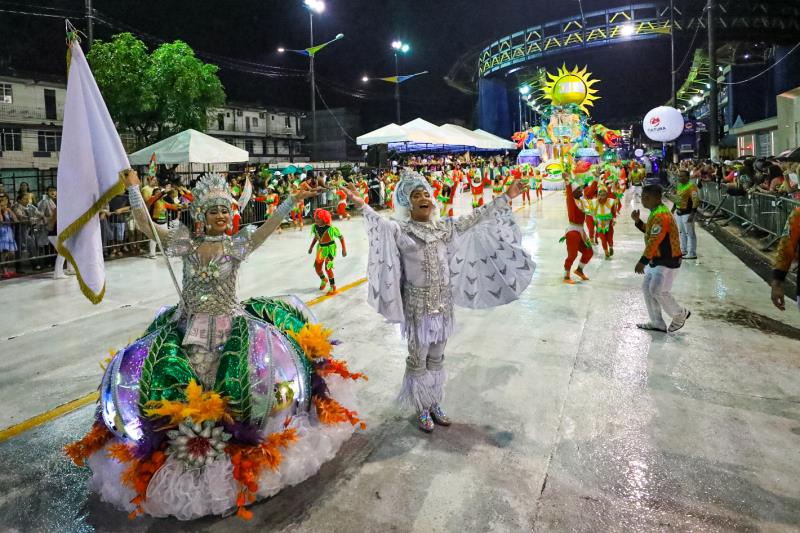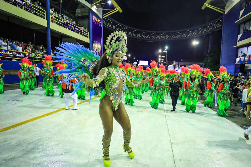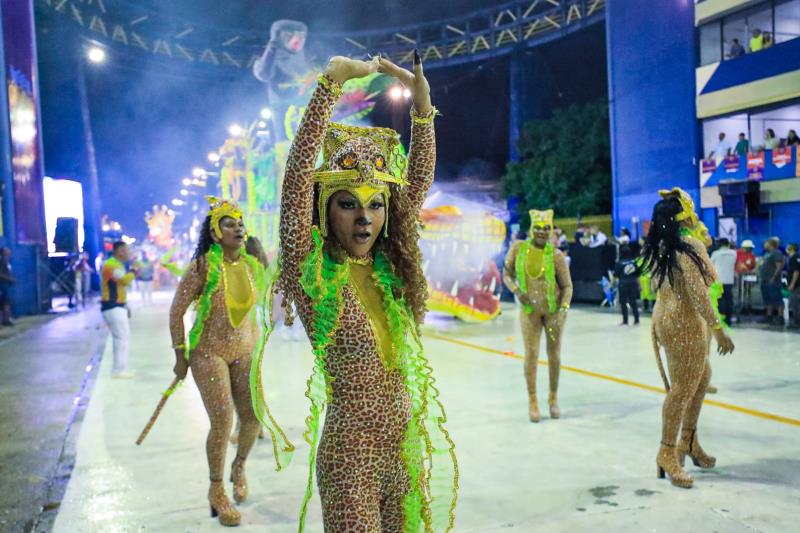 A comissão de frente se apresentou com os rostos cobertos, fazendo jus ao enredo da escola, encantando a avenida. O primeiro carro alegórico trouxe um sol no topo escrito “Juruê”, além de trazer o misticismo dos rios da Amazônia.