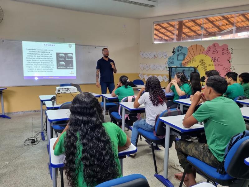 O tema "Injúria Racial", ministrado pelo GM Vinicius Serra, levou os alunos a pensar sobre comportamentos que nos levam a cometer discriminação racial. O guarda municipal ressaltou que racismo é crime e que precisa ser denunciado.