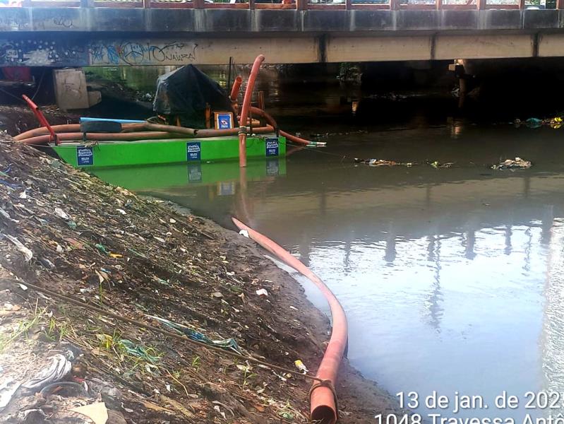 Uma balsa de sucção foi utilizada para a retirada das toneladas de lixo do canal da avenida Pedro Miranda, ao lado da Universidade da Amazônia (Unama), bairro da Pedreira. O trabalho possibilitou a desobstrução e o escoamento da água.
