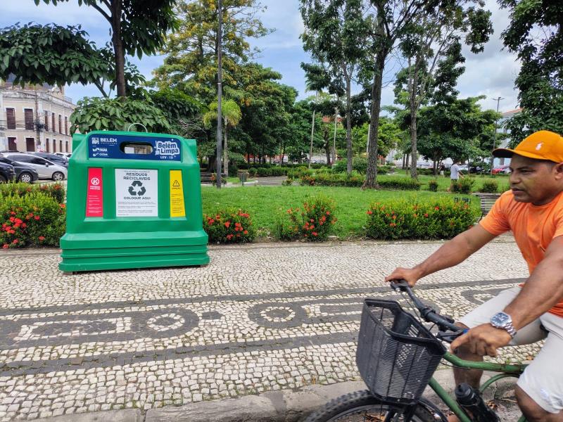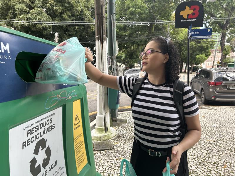 Funcionária de um banco em frente à Praça da República, no bairro da Campina, em Belém, Alcione fez questão de levar, antes do expediente, todo o material reciclável que havia separado em casa para descartar corretamente. Ela comemorou o fato da Prefeitura de Belém, por meio da Secretaria Municipal de Zeladoria e Conservação Urbana (Sezel), ter instalado na praça dois LEVs, Locais de Entrega Voluntária.