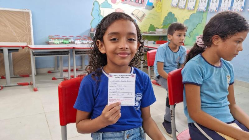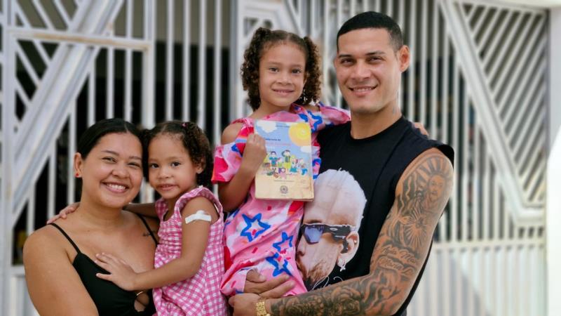 A ação também foi a oportunidade das irmãs Maria Alice, 3 anos, e Ayla Maria, de 5 anos, estudantes da UEI Santo Agostinho, aproveitarem para regularizar a carteira de vacinação. As duas chegaram na escola acompanhadas da mãe, Adriana Torres, e do pai, Weliton Pereira. “Elas acordaram bem cedo e sabiam que iam tomar vacina na escola hoje. Nós aproveitamos, porque nem toda vez tem no posto, aqui foi rápido e fácil”, disse Adriana.