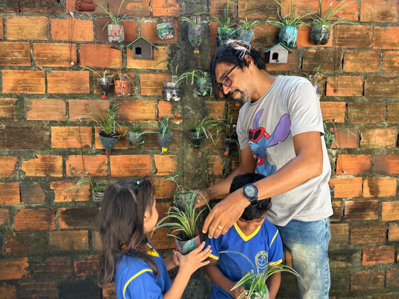 Os alunos participaram de todo o processo: pintaram garrafas PET que se transformaram em vasos, plantaram as mudas e hoje acompanham o crescimento das plantas. “Teve uma aula para ensinar como era a alimentação das plantas, o que a planta precisa para viver e como o vaso precisava ser composto para receber uma planta”, explica Antonio.