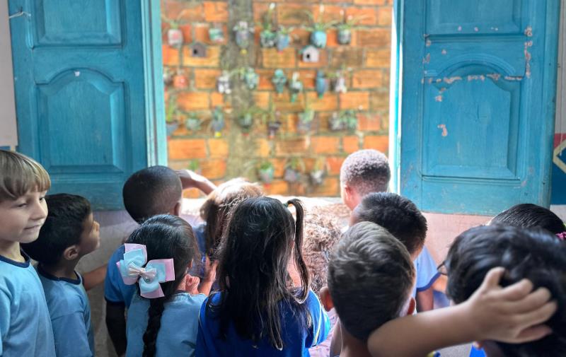 Os alunos das turmas do Jardim II do anexo escolar Associação de Mulheres Nossa Senhora Aparecida, no bairro do Tapanã, passaram a ter um novo olhar para o meio ambiente após terem participado da criação de um jardim vertical, que agora compõe a vista da janela da sala de aula.