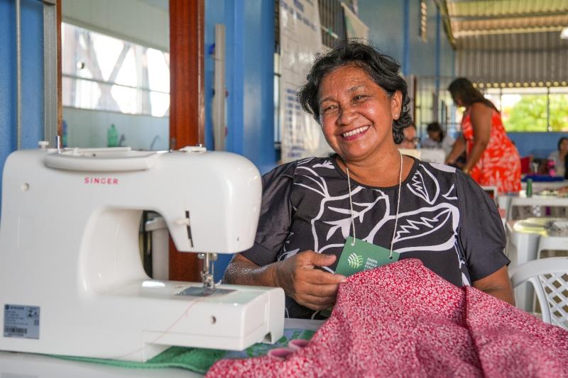 Moradora do bairro Jatobá, Carla Souza é cadeirante e conta que o curso de Corte e Costura tem sido uma oportunidade de renda extra e de cuidado com a mente. “Costurar ajuda a ocupar a cabeça e ainda garantir um dinheiro a mais. É uma terapia mesmo. A costura me faz criar uma peça aqui, outra ali, e isso contribui muito para a minha saúde mental. Eu me sinto muito feliz”, compartilha.